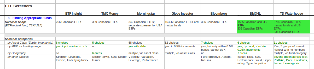 The free screeners provided as part of the standard discount broker account package capabilities from BMO Investorline and TD Waterhouse are fine tools and generally stronger than competing websites. Nevertheless they are not perfect in every way (is anything?) and the investor may benefit from cross-checking data with the other sites, or for obtaining unique data such as TMX's. For US ETFs, when preliminary screening involves US ETFs, some of the US-only websites may provide additional unique data.